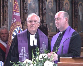 Die Offiziellen, d.h. die Delegation der Löbauer Stadtverwaltung, unsere Reisegruppe, die Vertreter der Minderheitengruppe, zogen nun zur Johanneskirche, die jetzt im renovierten Zustand ihren Helfern aus Deutschland erstmalig im neuen Glanz vorgestellt wurde. Der amtierende Pfarrer, der nunmehr 2. Pfarr-gemeinde von Löbau, Pfarrer (Ksiadz Proboszcz) Tadeusz Breza und der mit uns reisende Super-intendent i.R. Rudolf Steege hielten einen ökumenischen Gottes-dienst, erstmalig in dieser Kirche, in deutsch und polnisch. Es war ein feierlicher, aber auch erhebender Akt und der Chor und die Anwesenheit der Fahnengruppe unterstrichen die Handlung zusätzlich. Ich meine, wir können mit dem Eindruck und dem Erfolg zufrieden sein.
